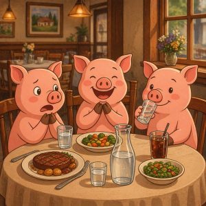 Dessert brought more of the same. The first pig picked a rich, sweet treat, the second went for a refreshing option, and the third pig cheerfully requested even more water. At this point, the waiter’s curiosity had grown, though he remained polite and attentive.